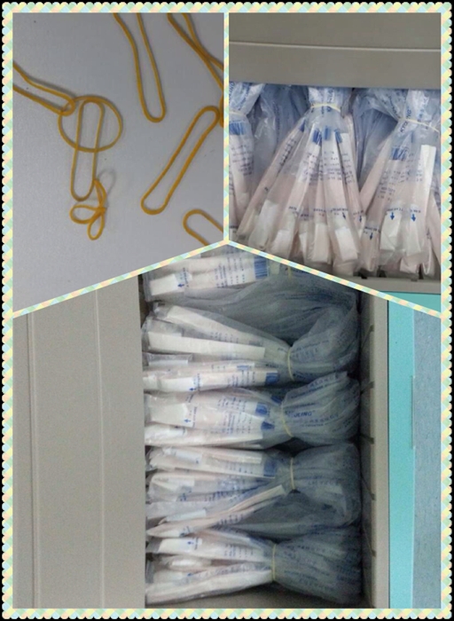 根据这个现状,大家献计献策,并从5S的管理理念中得到启发,大家自己创造出一套归类、摆放、补给和使用的方法好,即借助小小的工具——橡皮筋来改变此前的状况。方法如下:把20支或30支吸痰管用有弹性的皮筋归为一束,放置规定的抽屉中。收置病人时,根据病人的吸痰频率,疾病的周期选择20支或30支一束的吸痰管,定量定位整齐摆放在床头吊塔抽屉中。由于皮筋的弹性,在吸痰时抽出一支吸痰管后整束仍保持整齐。