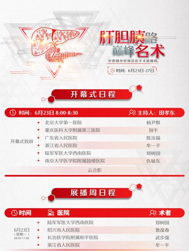 6月23日,由北京大学第一医院杨尹默教授、广东省人民医院陈汝福教授、浙江省人民医院牟一平教授、西南医院郑树国教授等全国知名的肝胆胰外科专家牵头举办的肝胆胰路巅峰名术——肝胆胰外科规范化手术直播周活动启动。该活动面向全国行业内直播,旨在规范肝胆胰外科手术操作,提高手术质量。