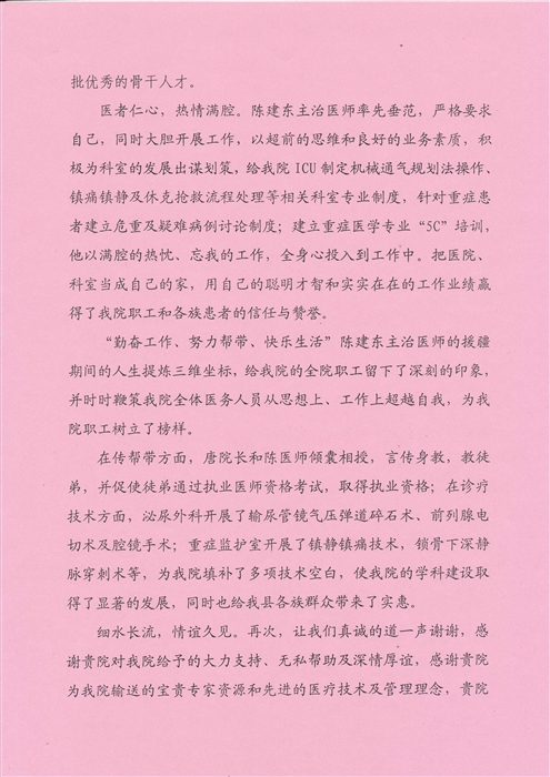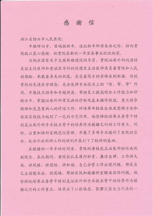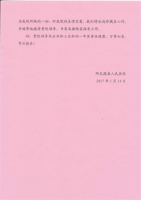 阿瓦提县人民医院致我院两位援疆医生的感谢信